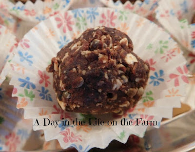 For these truffles I used the Protein Powder and a packet of Toasted Salted Hemp Seed.  The truffles are sweetened with prunes.  Don't tell anyone and they will never know.  You could also use dates or raisins but prunes was what I had in the cupboard.  They also received sugar from the peanut butter I used but you could use freshly ground or natural peanut butter if you want.  I was a little worried at first that the mixture for the truffles was to dry but they formed well when I started pressing them in my hands.