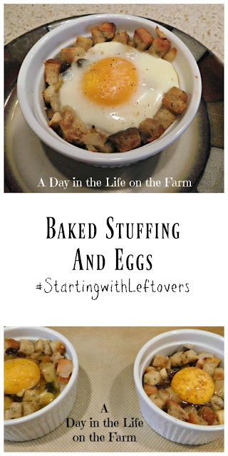 Butter the bottoms and sides of individual ramekins. Fill with leftover stuffing. Make a well in the center of the stuffing with the back of a spoon. Place an egg into the well. Bake in a preheated 375* oven for 15-20 minutes until egg is cooked to your liking.